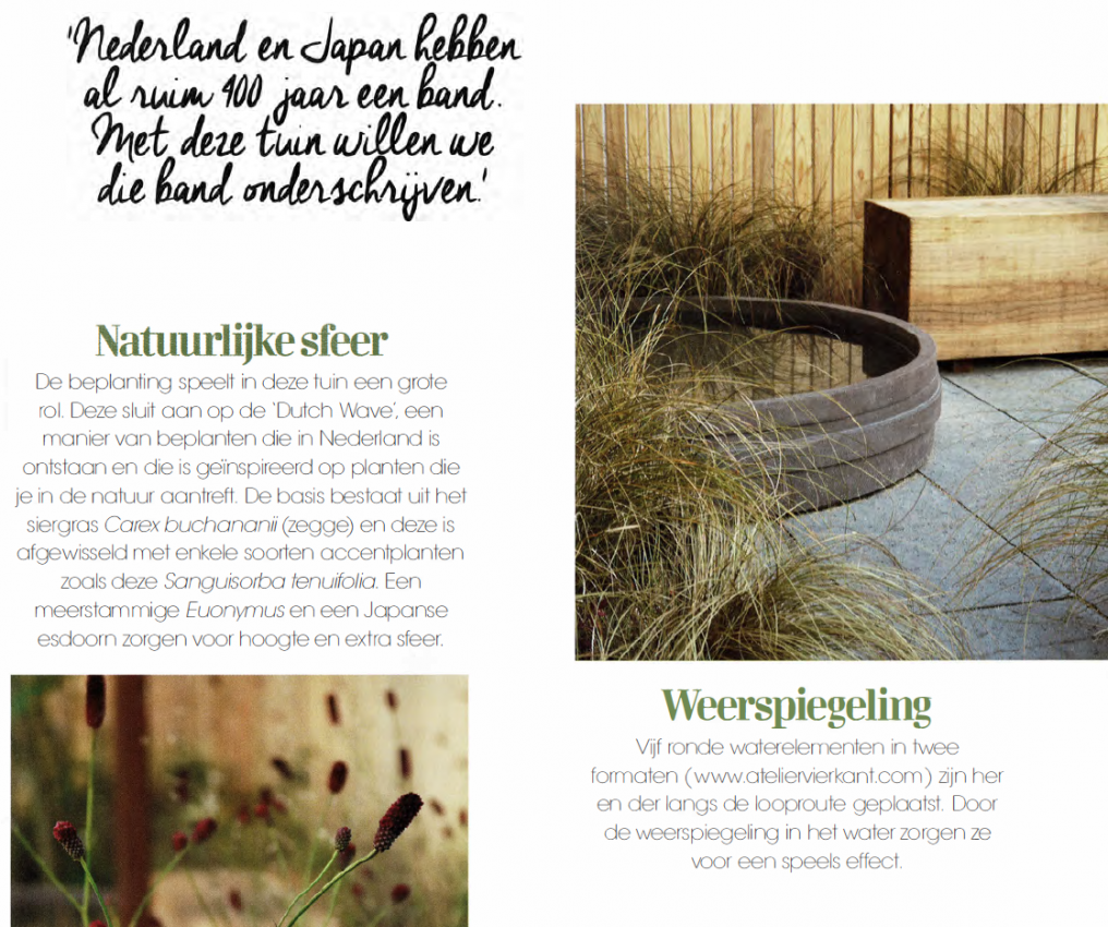 Voor de Japan Garden & Flower Show -in het themapark Huis ten Bosch in Nagasaki -ontwierpen Tom de Witte en Corinne Lecluyse deze 25 m2 grote tuin die bekroond werd met de derde prijs. Deze showtuin reflecteert de tuincultuur in Nederland. Het ontwerp is realistisch genoeg voor een eigentijdse privétuin, want je kunt er eenvoudig een terras aan toevoegen.